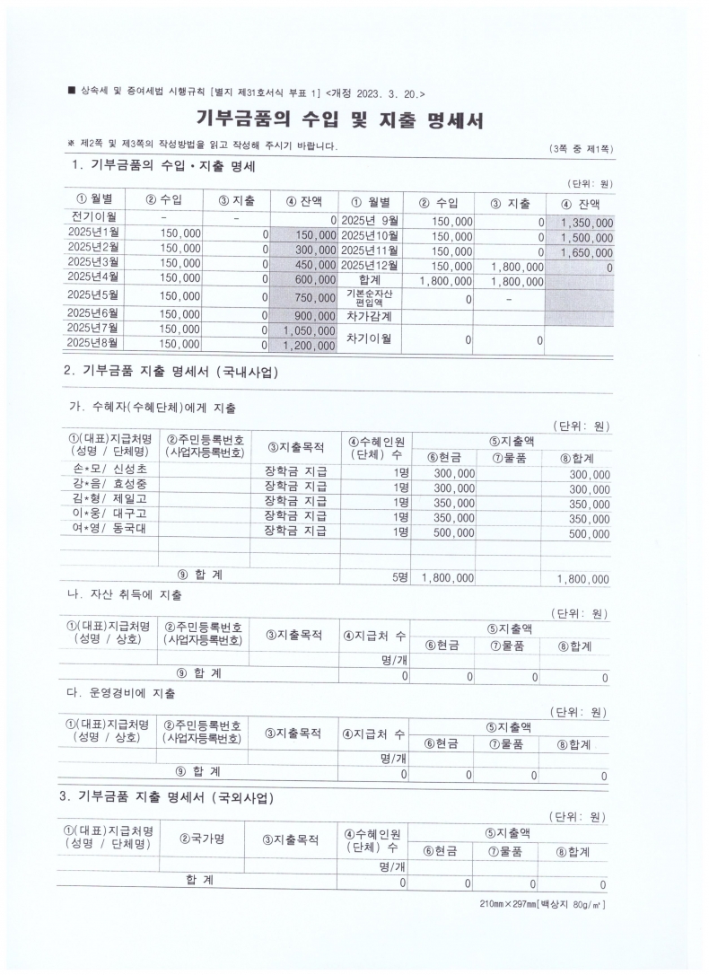 | 2025년 기부금 수입액 및 활용실적 명세서
